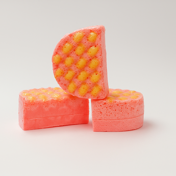 A fragranced exfoliating massage sponge infused with soap, perfect for use in the bath or shower as an alternative to traditional soap. Each sponge features one exfoliating side and one softer side for gentle cleansing, lasting approximately 2–4 weeks with regular use.