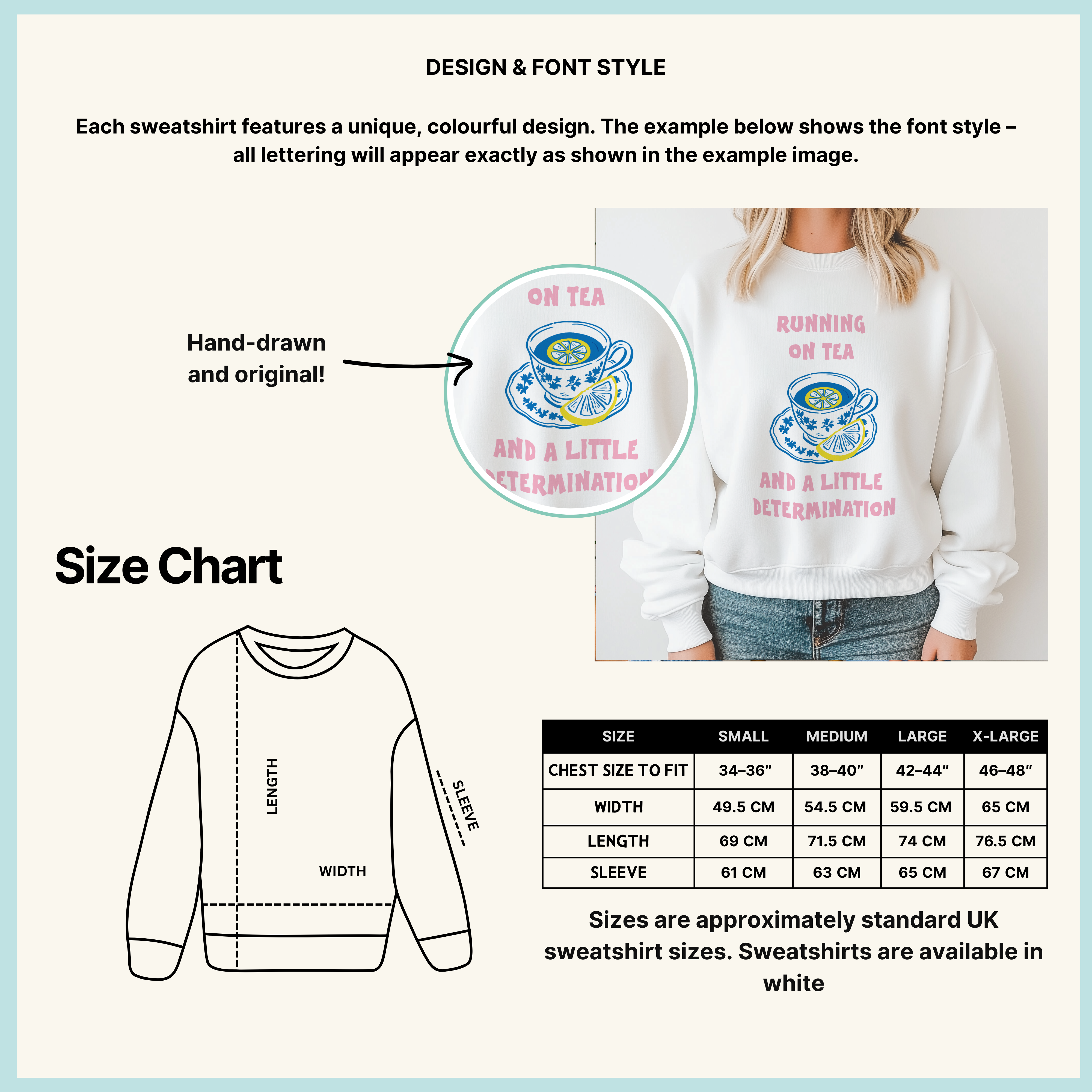 Meet your new go-to: the “Running on Tea and a Little Determination” sweatshirt — a comfy, feel-good slogan sweatshirt made for tea lovers, early risers, and anyone powering through with a brew in hand. Featuring a charming teacup illustration with lemon (hello, cosy vibes), this women’s graphic sweatshirt is perfect for everyday wear, gifting, or those “I’m trying my best” days.