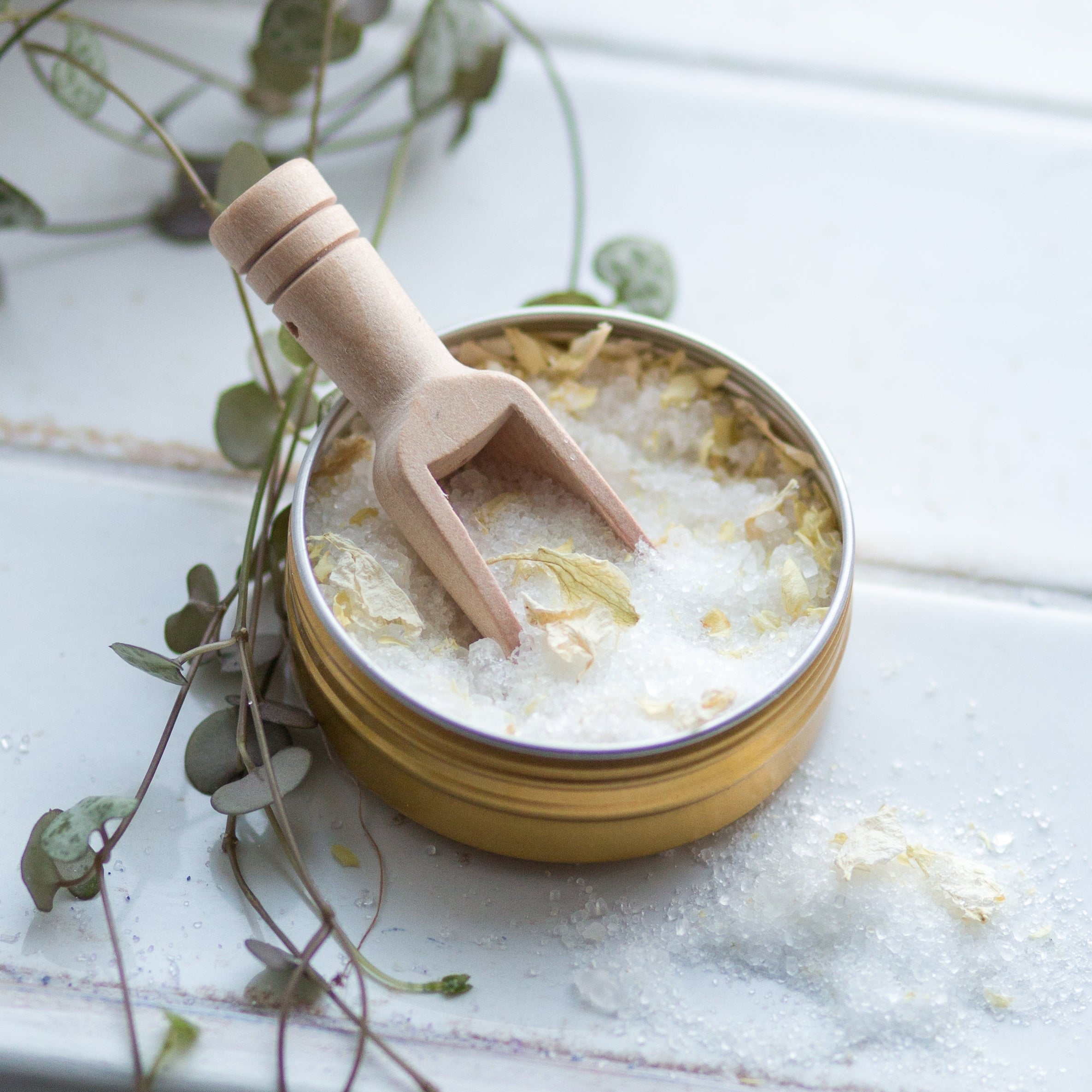 All of our soaking salts are made with a soothing blend of Epsom salts and Dead Sea salts, using both fine and coarse grain textures. Each mix is lightly sprinkled with 100% natural, biodegradable dried petals in soft ivory and off-white tones, adding a gentle touch of fragrance and elegance.
