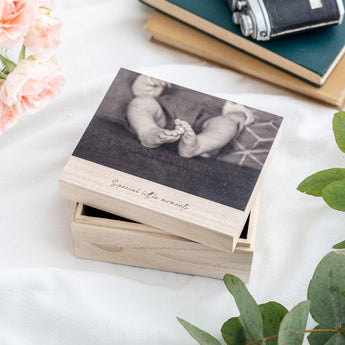 The box lid features your chosen photo which covers three-quarters of the box lid and then has your personalised text underneath. We've designed this as a box to store your memories of your new baby but it can be personalised however you like.