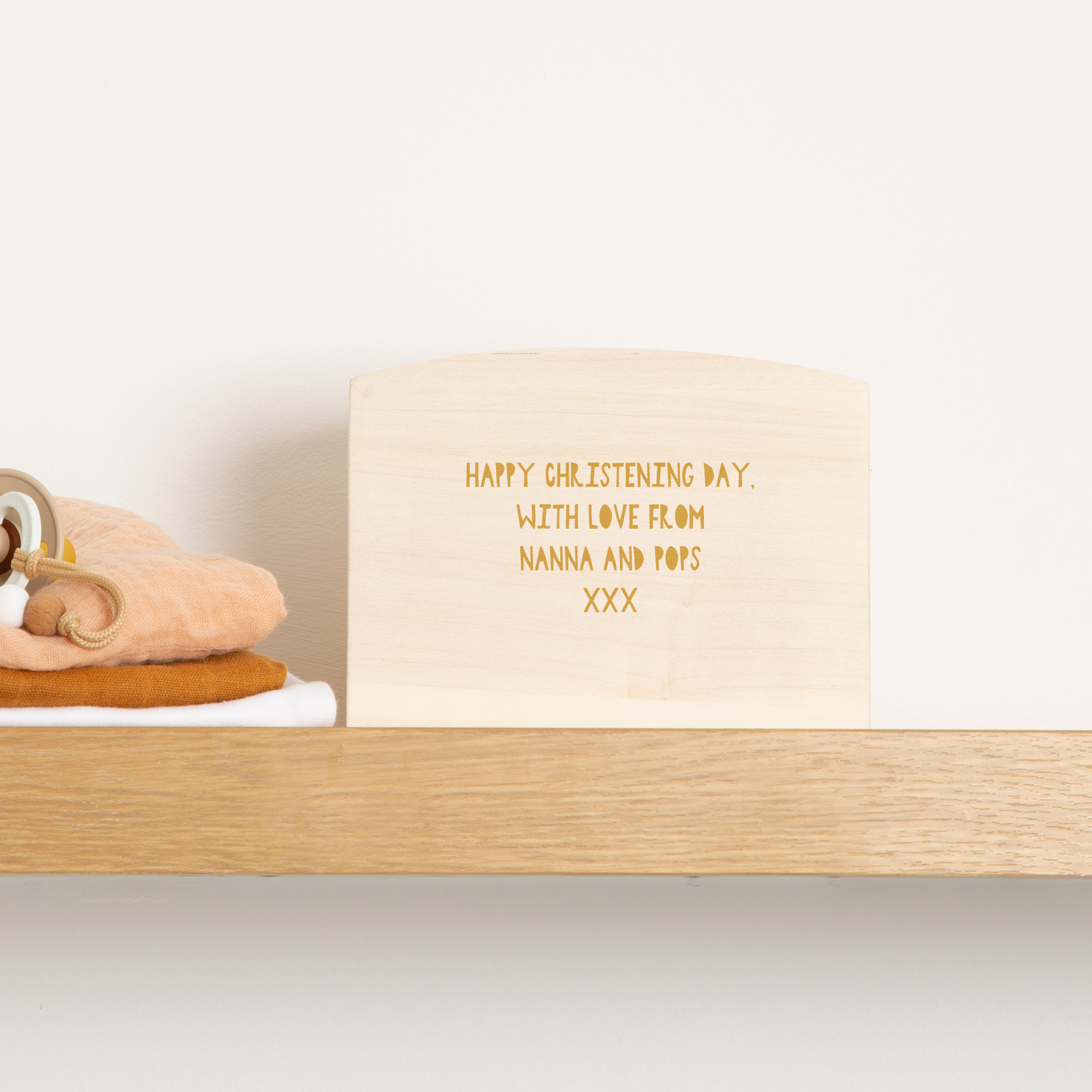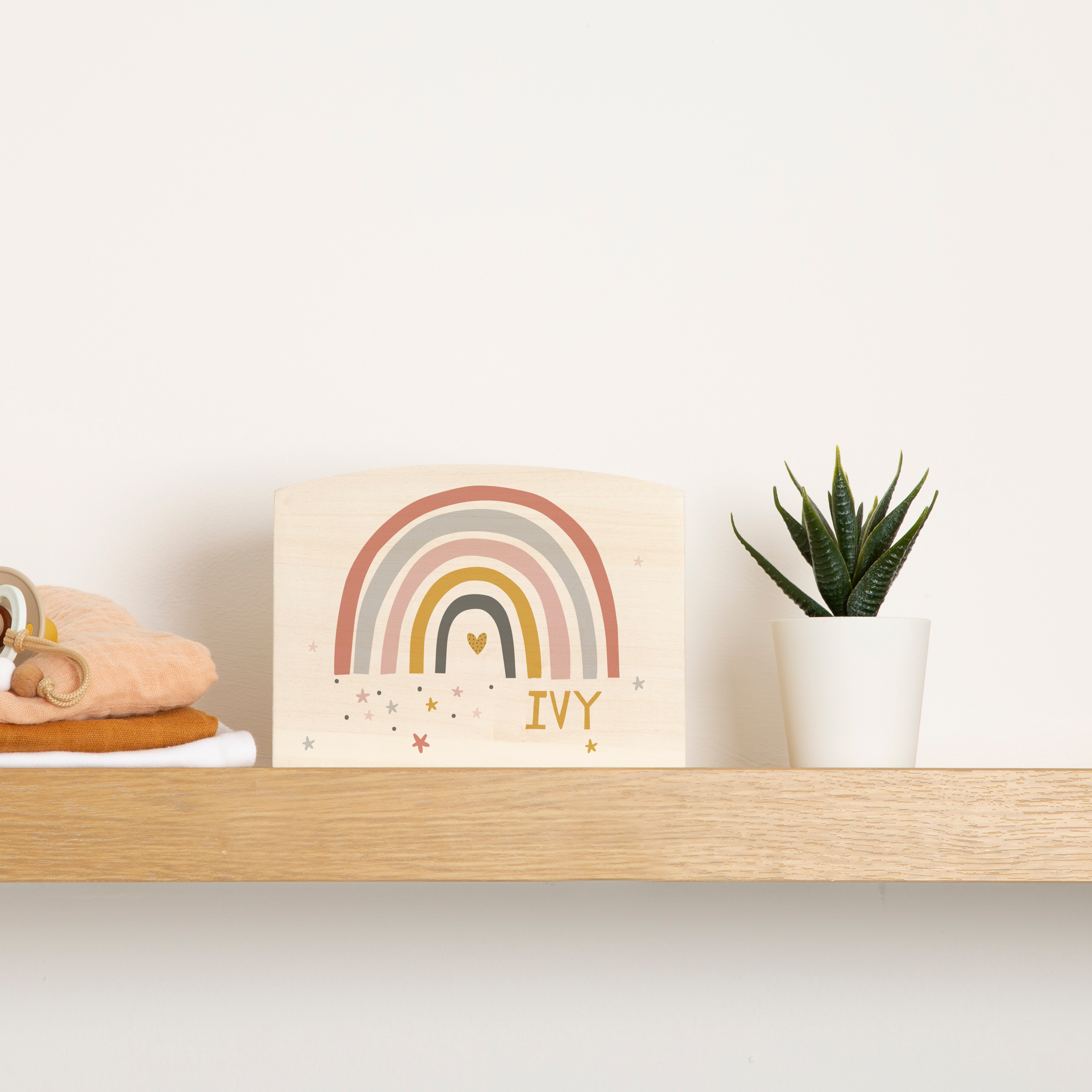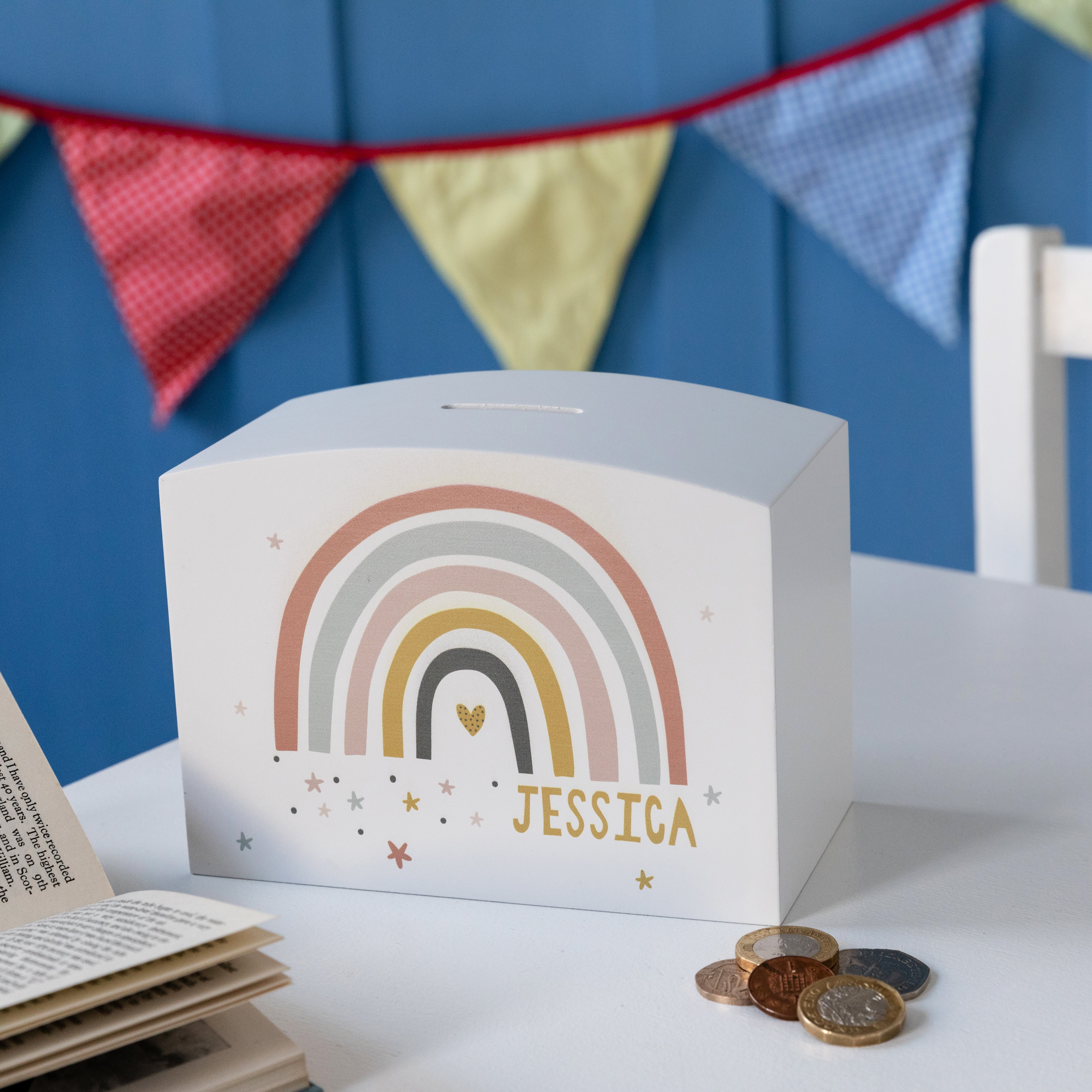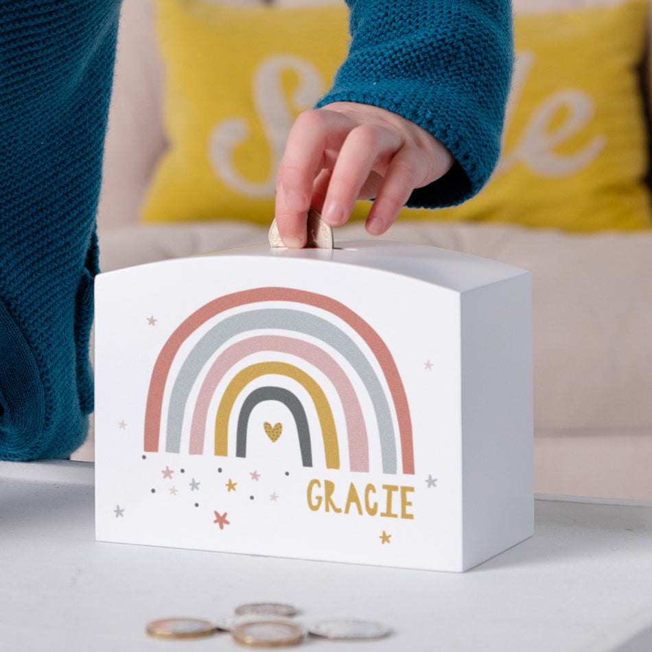 This wooden piggy bank features a lovely rainbow design in warm, modern earth colours. Personalise this money pot with a chosen name and give it as a thoughtful gift for birthdays, christenings or special occasions. It’s perfect for helping children learn about saving money and encouraging them to put coins aside for something they really want.