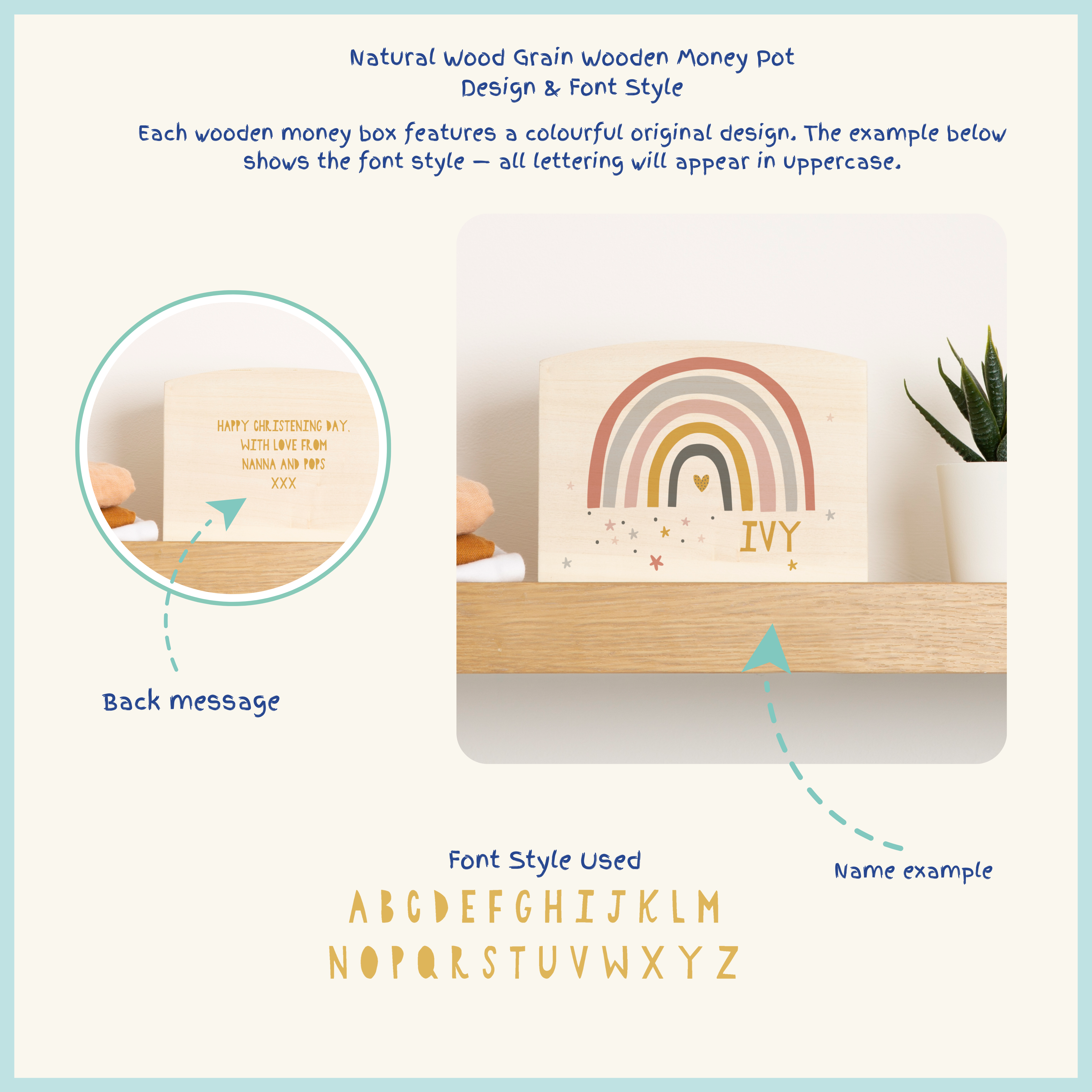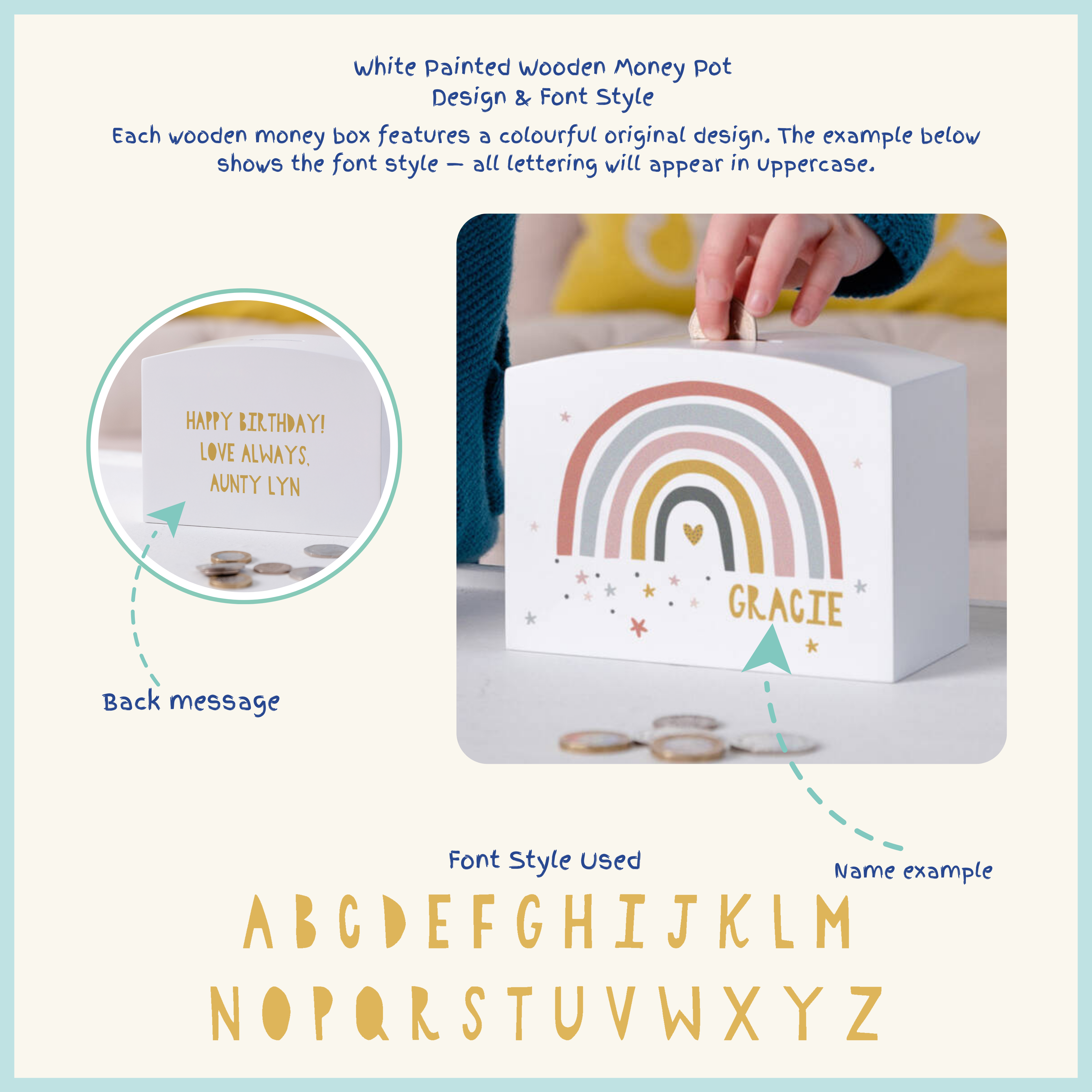Please note: the name will appear in capital letters, as shown in the product image. This money box is designed for holding coins and is available in a natural wood grain or a white painted wood finish.