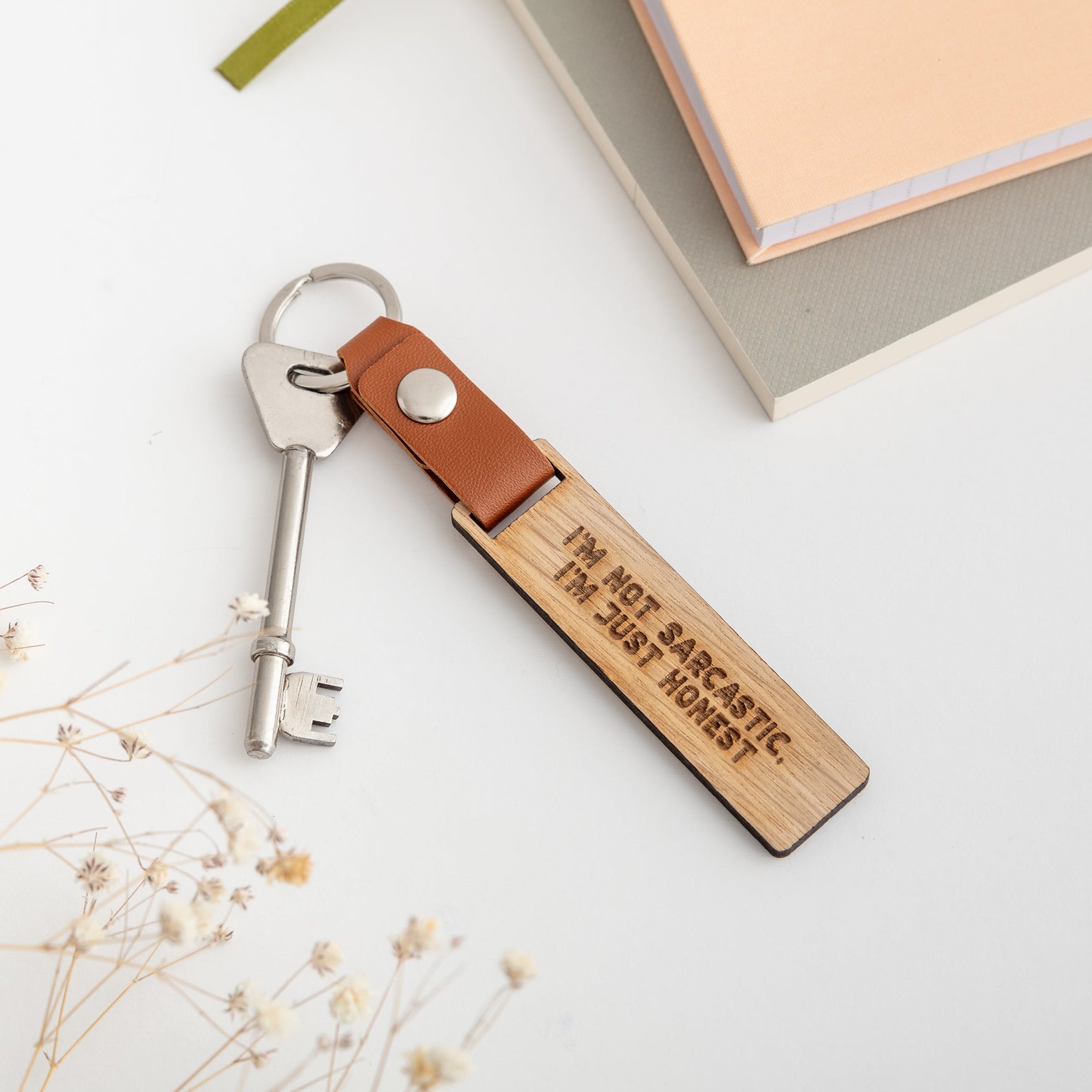 This keyring includes an oak-veneer rectangular tag engraved with your chosen wording, finished with a faux-leather strap and silver popper fastening. Choose from 4 strap colours to suit their style.
