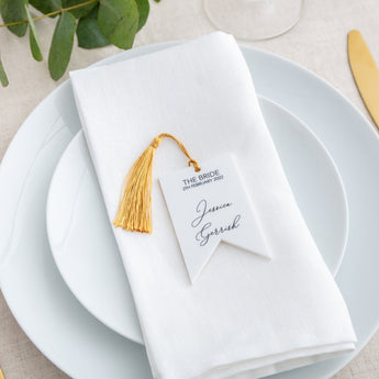 Each table name setting is provided with a white or gold tassel and printed with your chosen text. Simply enter the personalisation you would like on the place setting in the text fields provided. Please check your spellings are correct as your personalisation will be printed exactly as you have entered it.