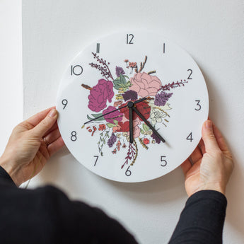 This acrylic clock features an illustration of a floral bouquet in a gorgeous mix of pinks, reds, creams and purples. It has bold numbers around the edge which stand out against the white background.