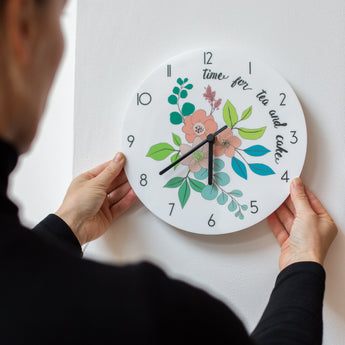 This acrylic clock features a pastel floral illustration with a mix of different flowers and leaves in a gorgeous mix of bright colours. It has bold numbers around the edge which stand out against the white background.