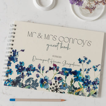 A stunning hardback cover guestbook personalised for your wedding day, printed with beautiful watercolour Forget Me Not flowers.